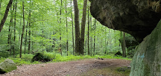 Today's activity with John & Connie was a short (about 4 miles) hike in the Heart's Content Scenic Area in the Allegheny National Forest. It's about 15 miles southwest of Warren, PA along gentle country roads - sometimes passing Amish farmers in their horse & buggies!! It was a very pleasant sunny day about 70*.The easy walk through the green green green forest is known for it's unusual rock formations.
