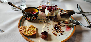 We went inside the restaurant to find a completely packed dining room with lots of tables inside & out. The outdoor area was not being used due to the recently ended rain, so the inside was mobbed. There was a 3 piece ensemble was playing. The guy playing the violin also played the piano. They were mostly playing classical sounding pieces although some must have been folk songs in a calming arrangement. Erion had warned us that there would be a lot of food & he was not exaggerating! Even the dessert came in 4 separate courses! Including an ice cream topped with freshly ground coffee beans that they circulated to grind directly into your bowl. Jan was not happy about that at all! She hates the smell of coffee! The appetizer courses included so many locally grown vegetables prepared in a variety of ways. It was all delicious. The meat dishes were all using locally raised & butchered animals. It was quite impressive. Erion said the majority of the crowd were local Albanians out to enjoy the bounty.